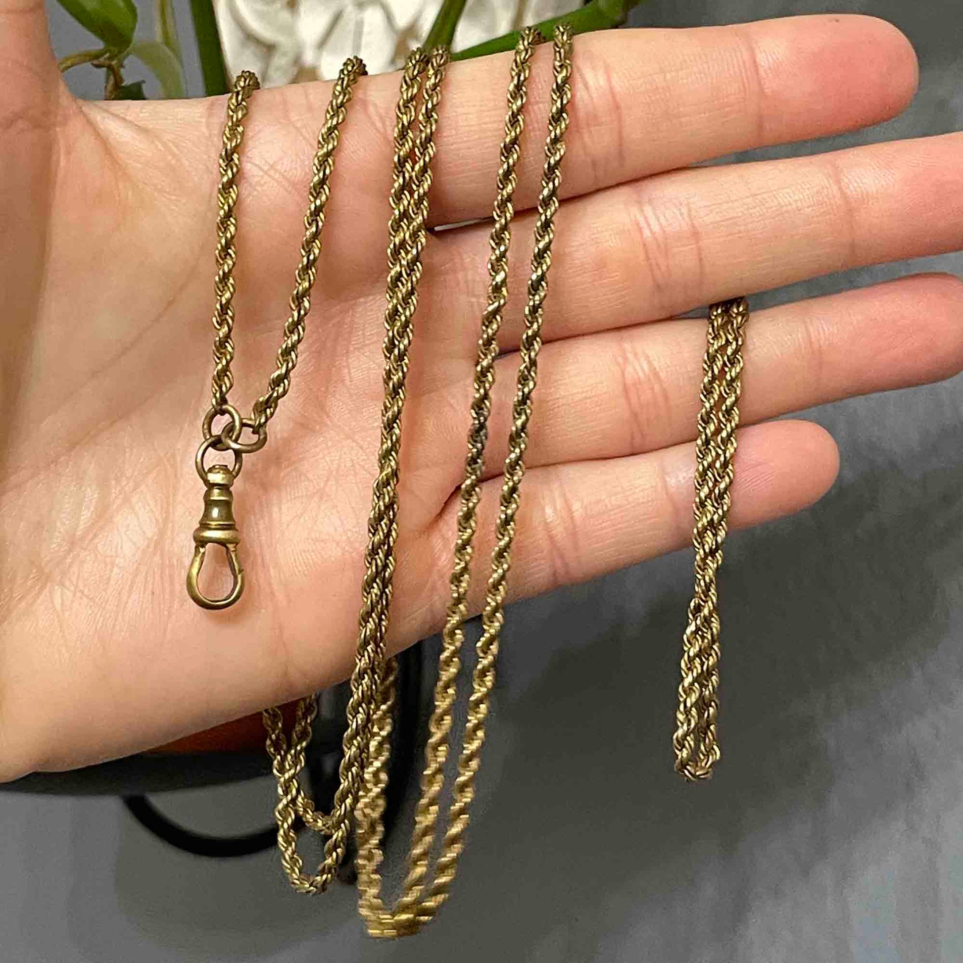 This antique Victorian muff guard chain is truly a standout. Made of high-quality rolled gold, it features a playful twisted rope design and a dog clip for attaching a fob or pendant. With a generous 50 inch length and a hefty weight of 26.2 grams, this piece can be worn multiple ways - as a long necklace, doubled, or even wrapped around your wrist as a unique bracelet. Don't miss out on this timeless and valuable addition to your jewelry collection!