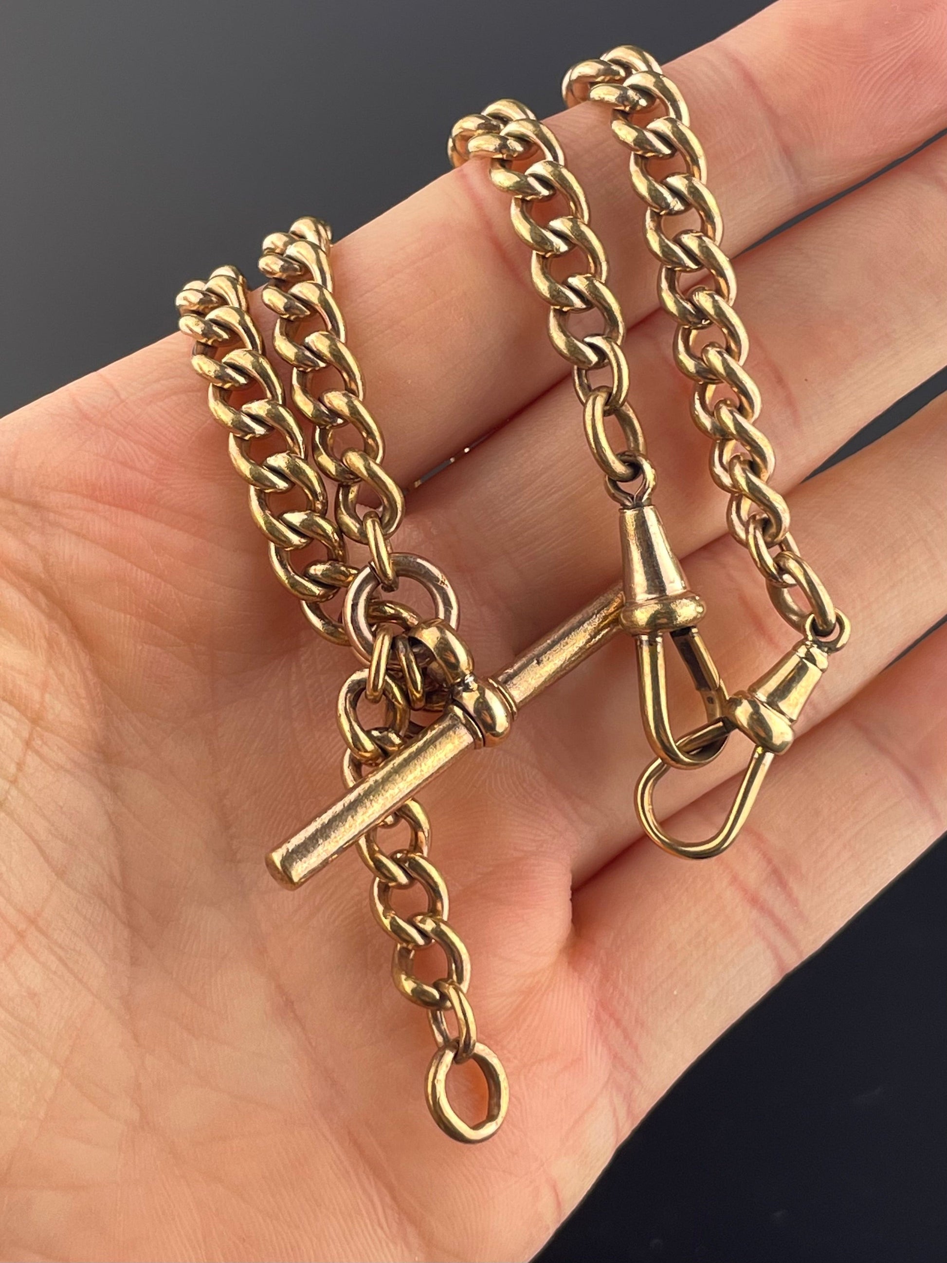 Charming?antique double Albert pocket watch chain in a rich rolled gold that can double as a necklace or bracelet. The curb chain has a center t-bar and matching drop chain ready to add a fob with each end having a swivel dog clip. A striking Albert chain to wear with a pocket watch for the gents, wear as a necklace for the ladies, or wrap around your wrist for a unique look!