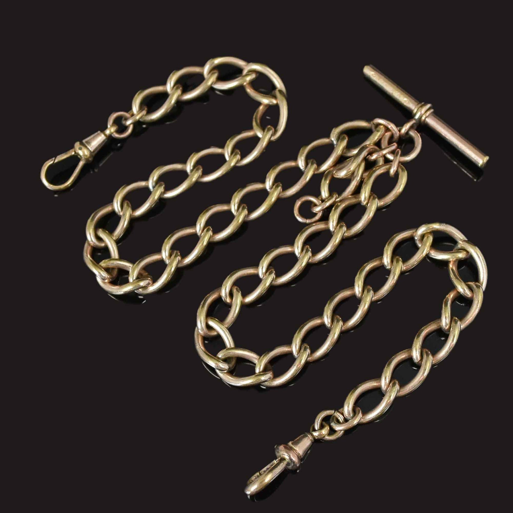 Chic and elegant?antique double Albert pocket watch chain in a rich rolled gold that can double as a necklace or bracelet. The curb chain has a center t-bar and matching drop chain ready to add a fob with each end having a swivel dog clip. A striking Albert chain to wear with a pocket watch for the gents, wear as a necklace for the ladies, or wrap around your wrist for a unique look!