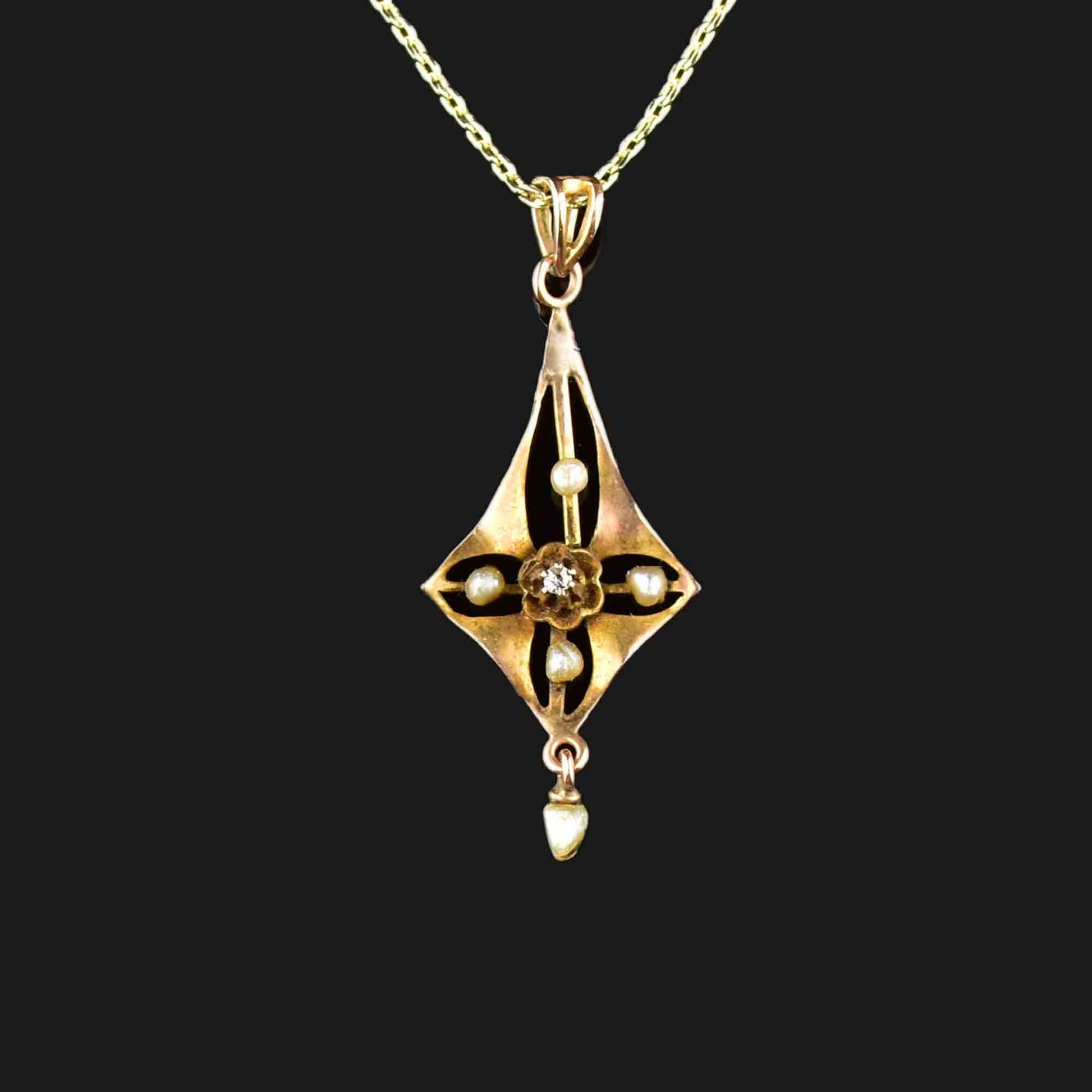 Antique Edwardian 10K Gold Diamond Pearl Lavalier Necklace
