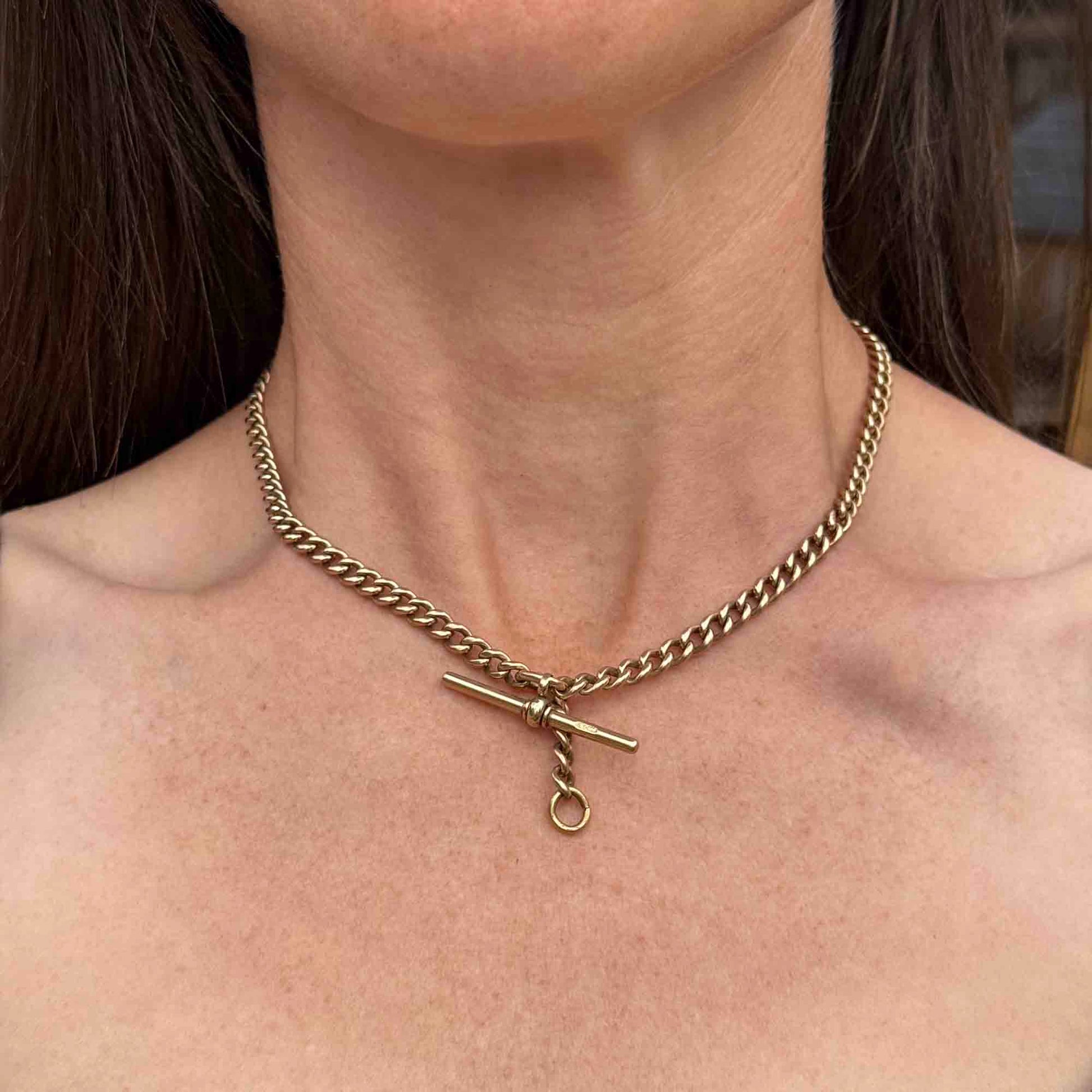 A timeless and classic antique Edwardian double Albert watch chain necklace! The rolled gold curb chain has a center t-bar and matching drop chain ready to add a fob with each end having a swivel dog clip. The classic Albert chain to wear with a pocket watch for the gents, wear as a necklace for the ladies, or wrap around your wrist for a unique look! A timeless treasure!