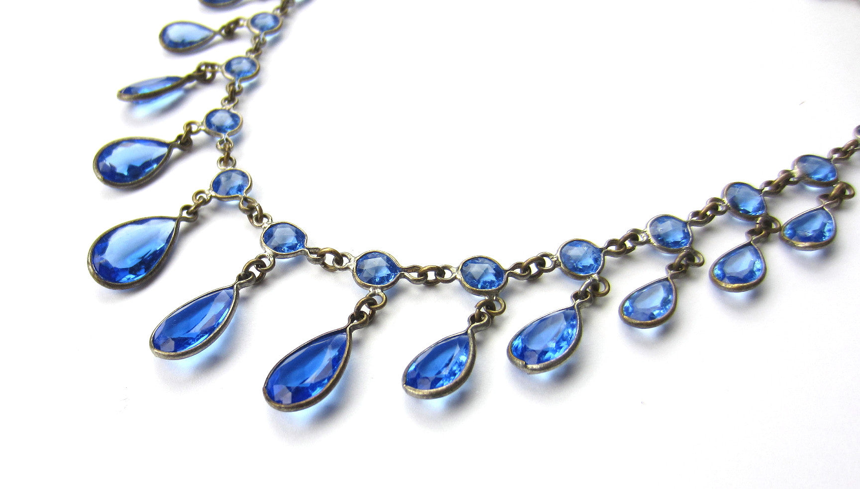 A drippy and elegant Art Deco era necklace comprised of faceted round and teardop shape sapphire glass bezel set in brass circa 1930. ?Most likely another great Czech piece!