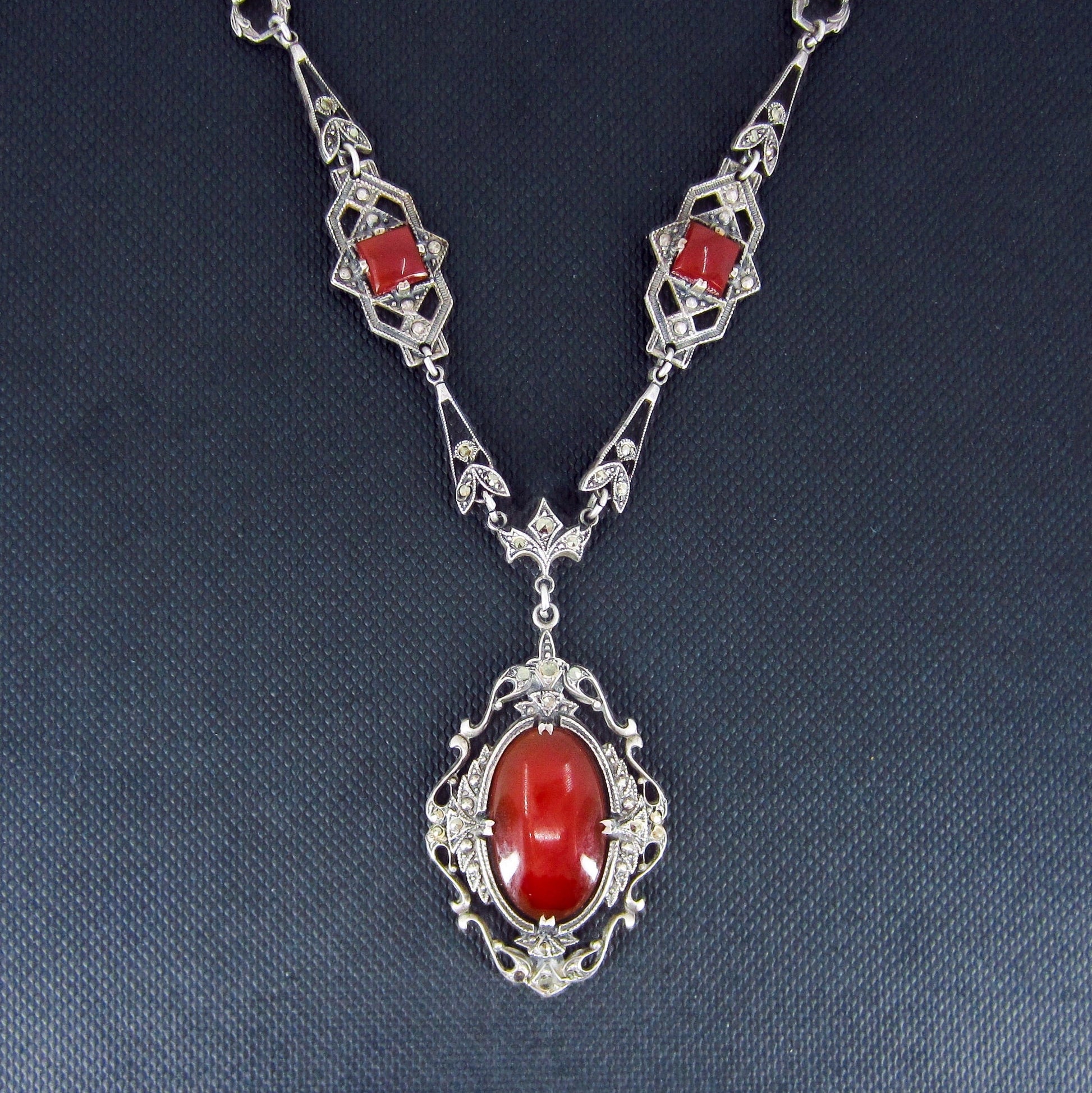 Everyone who knows the store or me knows how much I love these Art Deco marcasite pieces! ?Look at this gorgeous necklace, it¡¯s super ornate with beautifully colored carnelian and marcasite in sterling silver circa 1930. ?Thought has been put into the design of every millimeter of this necklace, add it to your Deco collection or start one today!