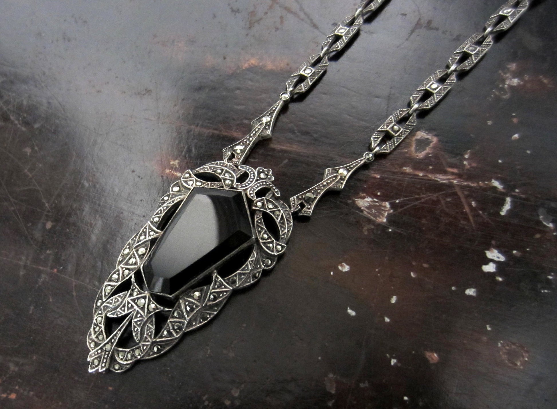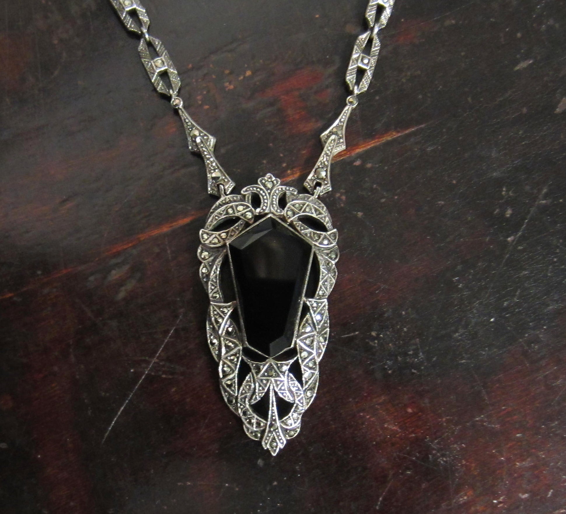 Every time I see this necklace in the case at the store, in my mind I think, The Black Heart--this is my secret name that I've given this piece.? It is beautiful and dramatic, with a dark sparkle--it reminds me of something Cersei in Game of Thrones would wear!? Made in the 1930's, this necklace features a faceted onyx in an ornate frame of marcasites set in sterling silver, with a maracasite studded chain.? And it was made in Germany, as of course all of the superb marcasite pieces from this period were!? Do you need to wield some dark, queenly power?? Here's your necklace your majesty!