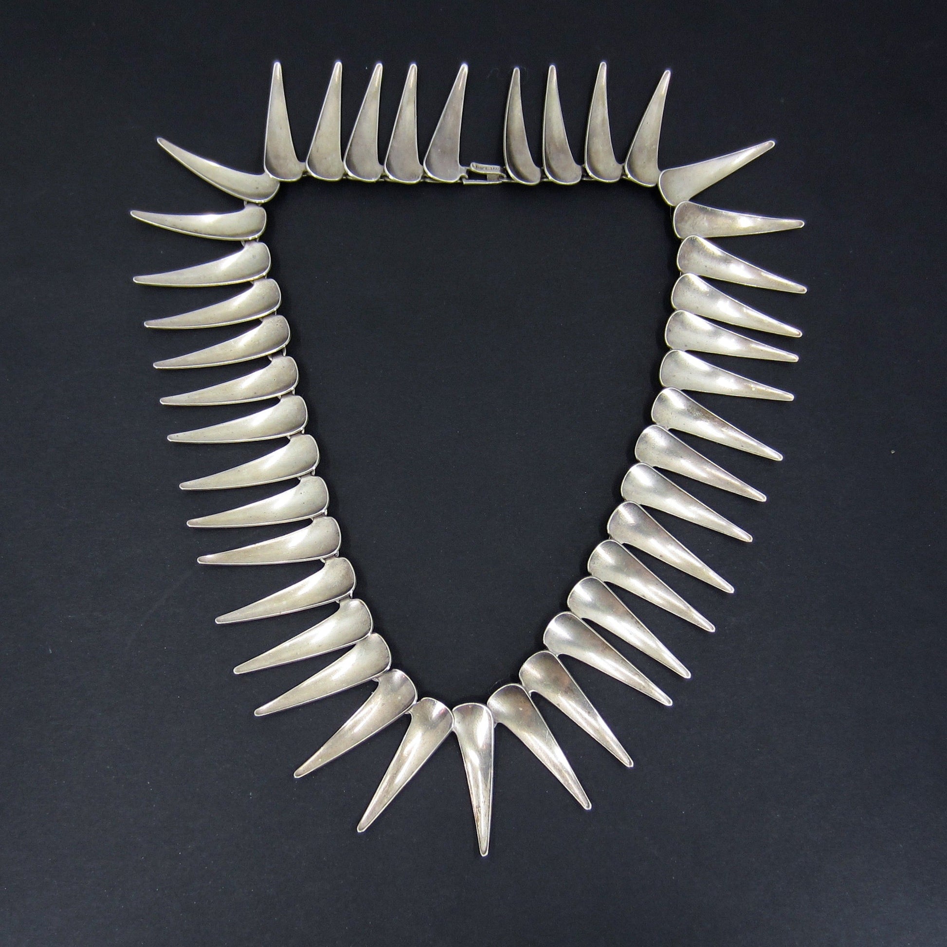 This fabulous necklace was made by the acclaimed Swedish silversmith house Atelier Borgila of Stockholm.? Featuring articulated segments with a curved, delicate concave sweep, this necklace has both Atomic Age and African influences commonly seen but rarely so well executed in the 1950's.? Full Swedish hallmarks for Stockholm 1958.