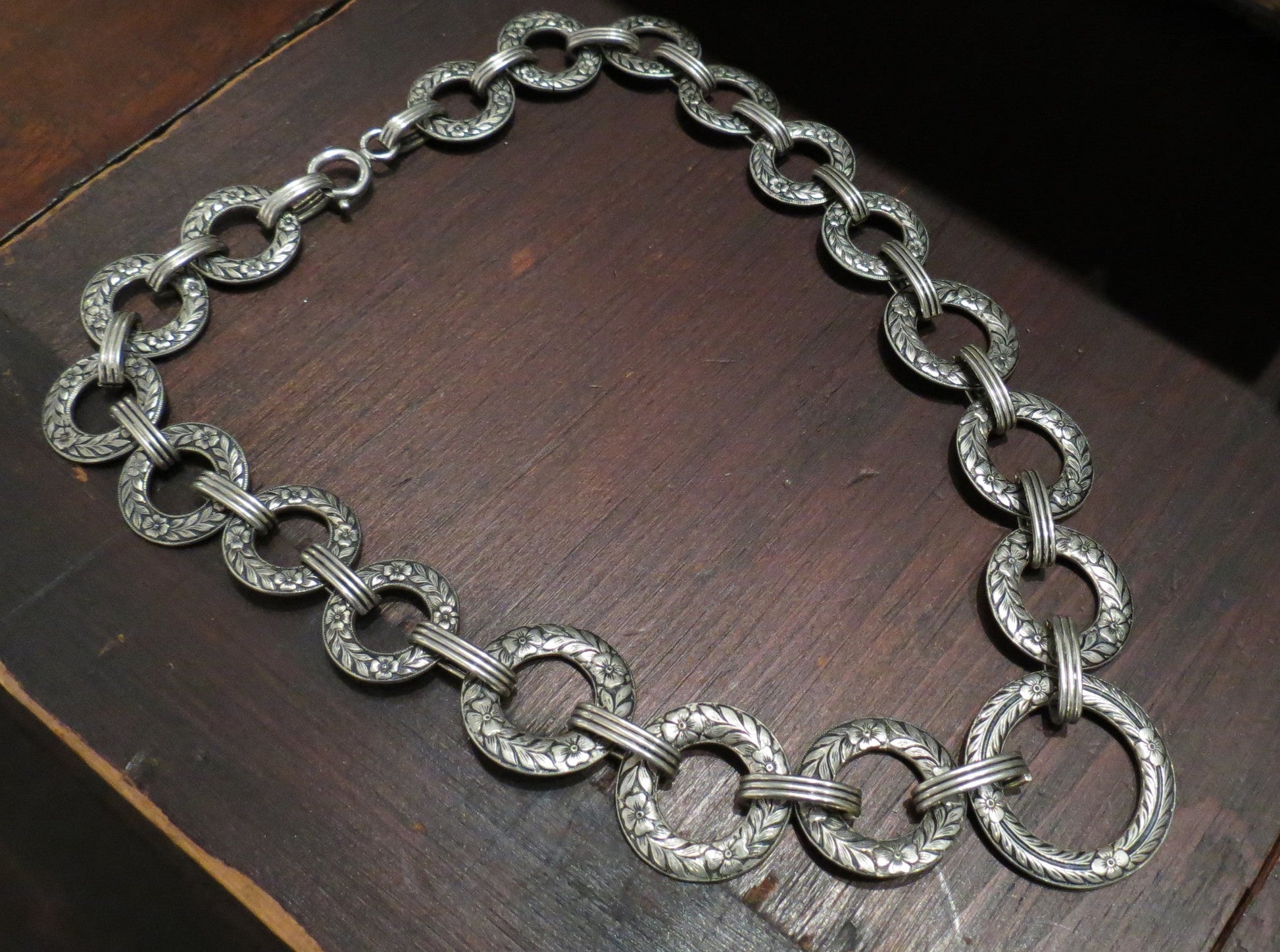 Look at this gorrrrgeous Art Deco necklace from the 1930's! ?Designed as graduated open circles with a floral pattern on both the front and back, this necklace has a modernist heavy chain look with vintage feminine details. ?The best of both worlds! ?